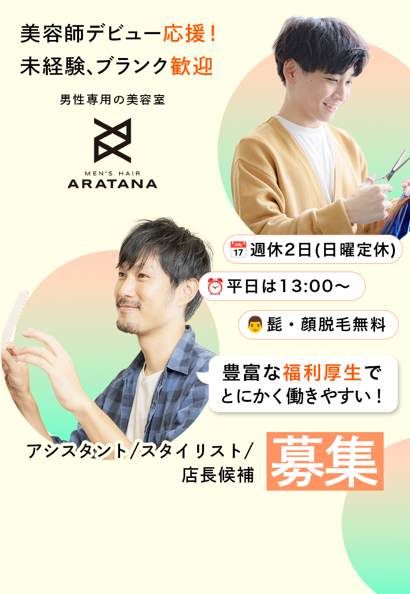 募集要項 雇用形態 正社員 給与 アシスタント 20〜24万円 基本給22万円 ・皆勤手当1万円・交通手当上限1万円(公共交通機関利用)・技術手当5000円〜20000円※総売上70万以下はアシスタントとなります Jr.スタイリスト 24〜29万円 基本給22万円 ・皆勤手当1万円・交通手当上限1万円(公共交通機関利用)・技術手当2万円・歩合手当3万円※総売り上げ70万以上で歩合手当がつきます スタイリスト 29〜55万円 基本給22万円 ・皆勤手当1万円・交通手当上限1万円(公共交通機関利用)・技術手当2万円・歩合手当 店長 40〜65万円 基本給22万円 ・皆勤手当1万円・交通手当上限1万円(公共交通機関利用)・技術手当2万円・歩合手当14万円・管理職手当 休日 完全週休2日制平日1日+日曜定休日 週休二日制 平日すべて満席状態の場合、土曜休みも可 ・日曜日定休+平日1日(週休2日)・正月(4〜5日)・ゴールデンウィーク(約80%は休み)・夏休み(5日間) 勤務時間 月〜金曜日 13:00-22:30(実働8時間/休憩1時間半) 土・祝日 10:00-19:00(実働8時間/休憩1時間) 福利厚生 雇用保険/労災保険/有給10日間/結婚祝い金・出産祝い金(10万円)/制服貸与/独立支援制度(FC展開)/社員紹介の採用報酬(報奨金双方に30万円 ※店規定による)/育児休暇(産後1週間その後1ヶ月間は半日出勤可能) 業務内容 アシスタント カット以外の全般業務 スタイリスト カット、白髪染め、パーマ 店長 カット、白髪染め、パーマ、店舗管理、在庫管理 ※男性専用の美容室です。 ※当店のカラーは白髪染めのみになります。 必要資格 ・美容師免許 ⭐︎未経験歓迎 ARATANAについて 公式サイト 〒812-0007福岡県福岡市博多区東比恵2-20-22 モンフレール東比恵101号室 092-409-4194 \\ 15分面談からでもOK!//